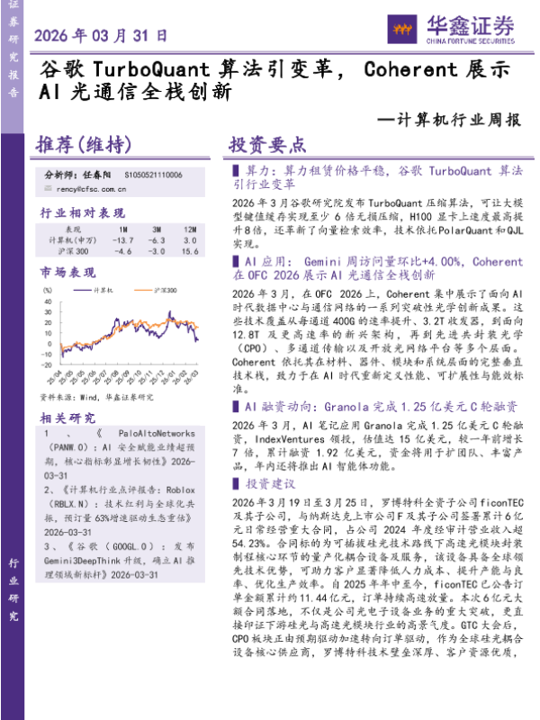 【华鑫证券】【202603】计算机行业周报:谷歌 TurboQuant算法引变革,Coherent展示 A I光通信全栈创新-18页 证券期货研究报告