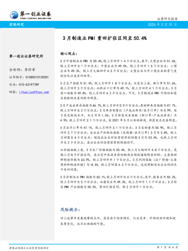 【第一创业证券】【202603】2026年3月制造业PMI重回扩张区间至50.4%-6页 证券期货研究报告