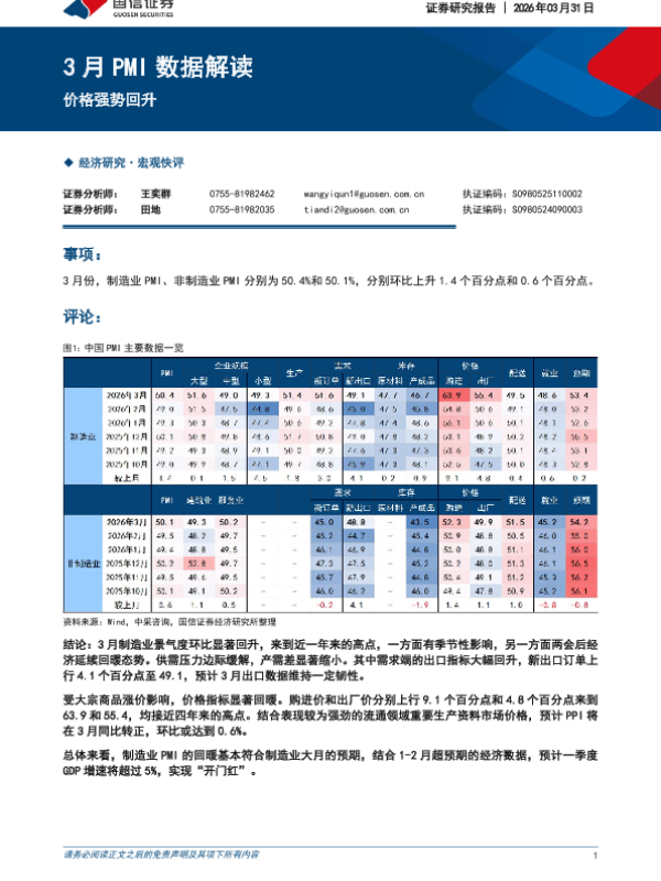 【国信证券】【202603】3月PMI数据解读:价格强势回升-6页 证券期货研究报告