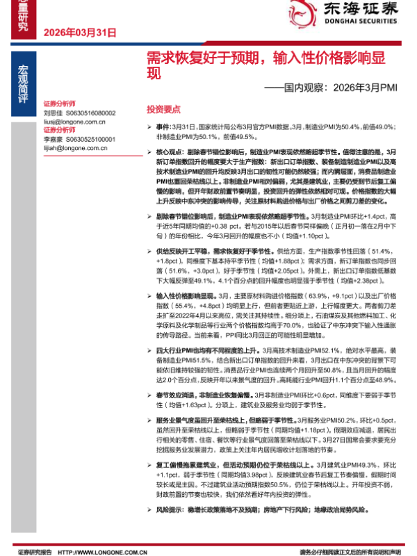 【东海证券】【202603】国内观察:2026年3月PMI:需求恢复好于预期,输入性价格影响显现-4页 证券期货研究报告