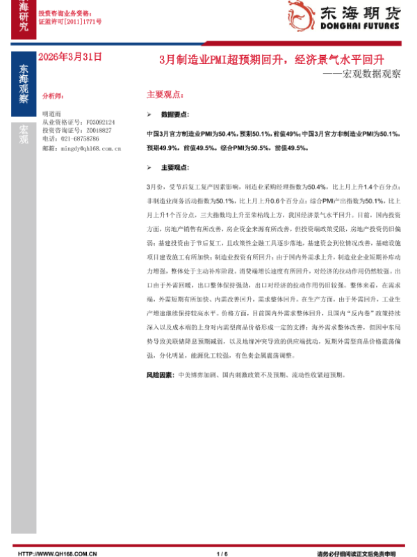 【东海期货研究所】【202403】3月制造业PMI超预期回升,经济景气水平回升——宏观数据观察-6页 证券期货研究报告