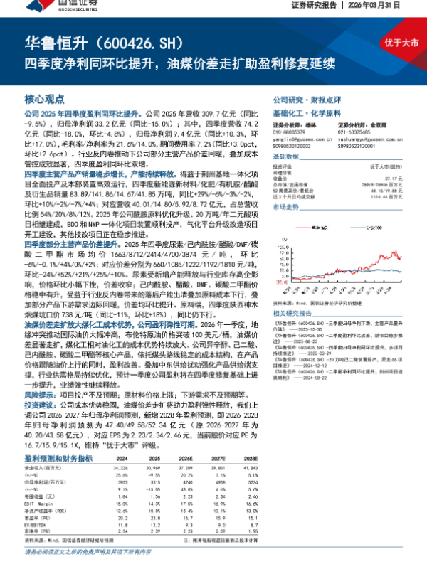 【国信证券】【202603】优于大市 华鲁恒升(600426.SH) 四季度净利同环比提升,油煤价差走扩助盈利修复延续-7页 证券期货研究报告