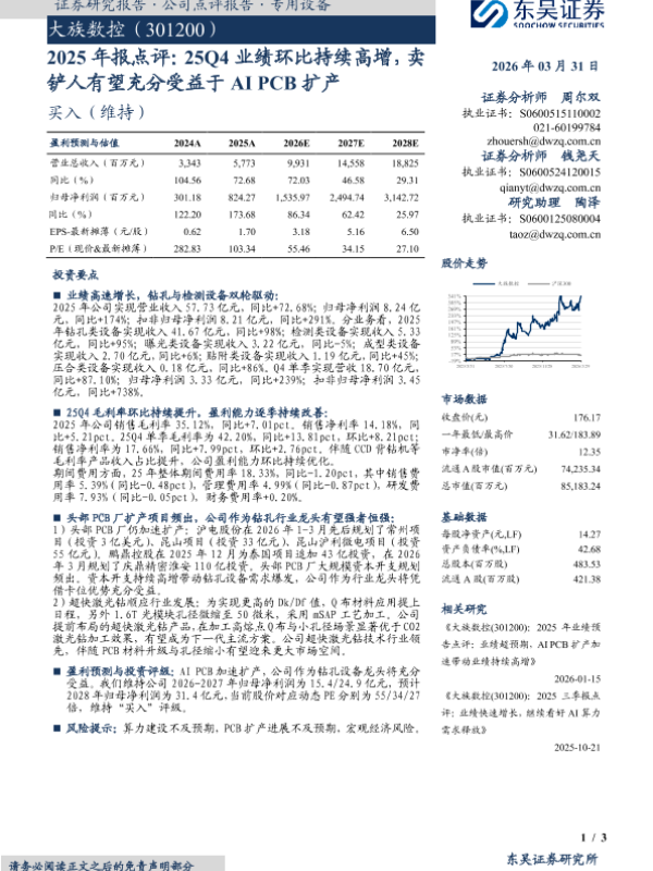 【东吴证券】【202603】2025年报点评:25Q4业绩环比持续高增,卖铲人有望充分受益于AI PCB扩产-3页 证券期货研究报告