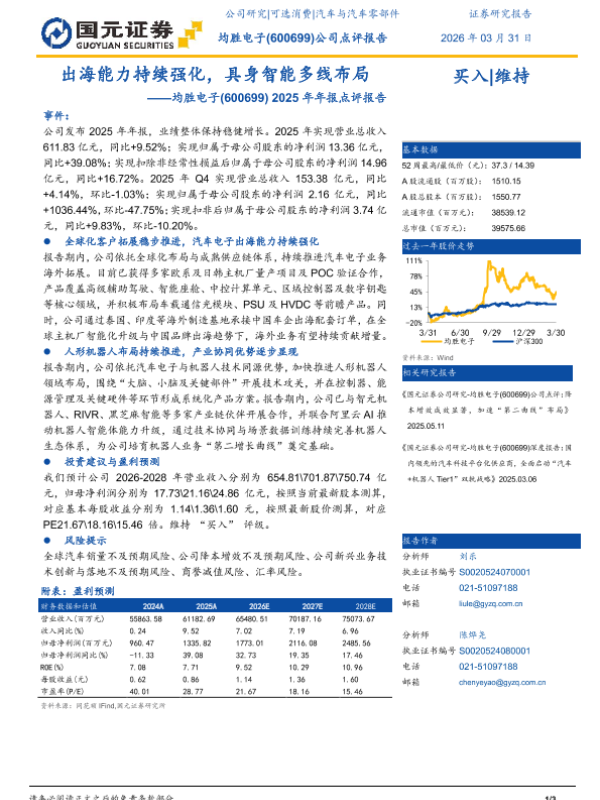 【国元证券】【202504】业绩如期兑现,北美整体转盈出海能力持续强化,具身智能多线布局——均胜电子(600699)2025年年报点评报告-3页 证券期货研究报告
