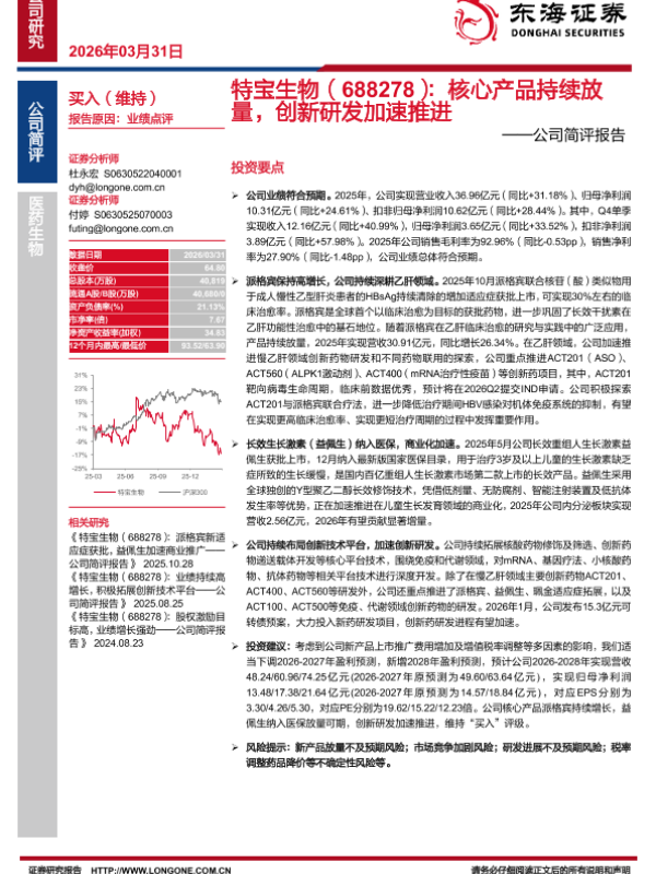 【东海证券】【202603】特宝生物(688278):核心产品持续放量,创新研发加速推进——公司简评报告-4页 证券期货研究报告