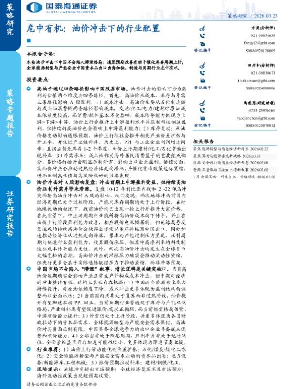 【国泰海通】【202603】危中有机:油价冲击下的行业配置-27页 证券期货研究报告
