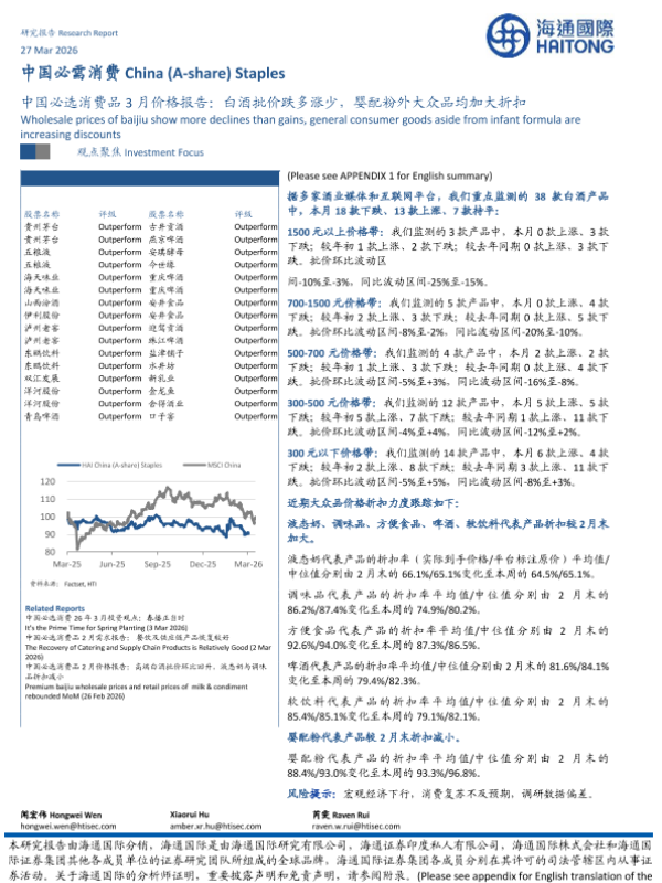 【海通国际】【202603】中国必选消费品3月价格报告:白酒批价跌多涨少,婴配粉外大众品均加大折扣-14页 市场调研