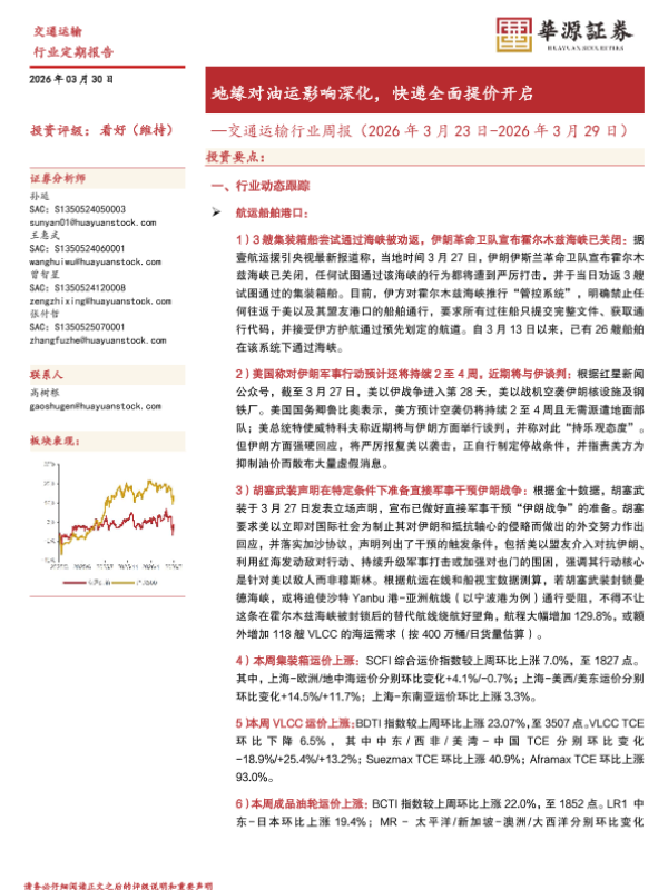 【华源证券】【202603】地缘对油运影响深化,快递全面提价开启——交通运输行业周报(2026年3月23日-2026年3月29日)-17页 证券期货研究报告