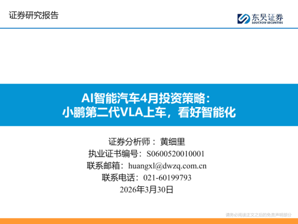 【东吴证券】【202603】AI智能汽车4月投资策略:小鹏第二代VLA上车,看好智能化-43页 证券期货研究报告