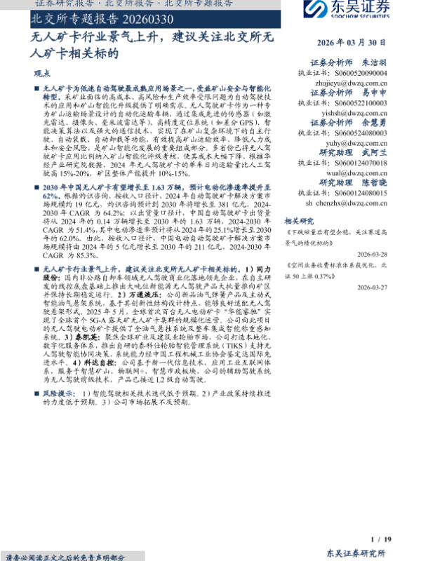 【东吴证券】【202603】无人矿卡行业景气上升,建议关注北交所无人矿卡相关标的-19页 证券期货研究报告