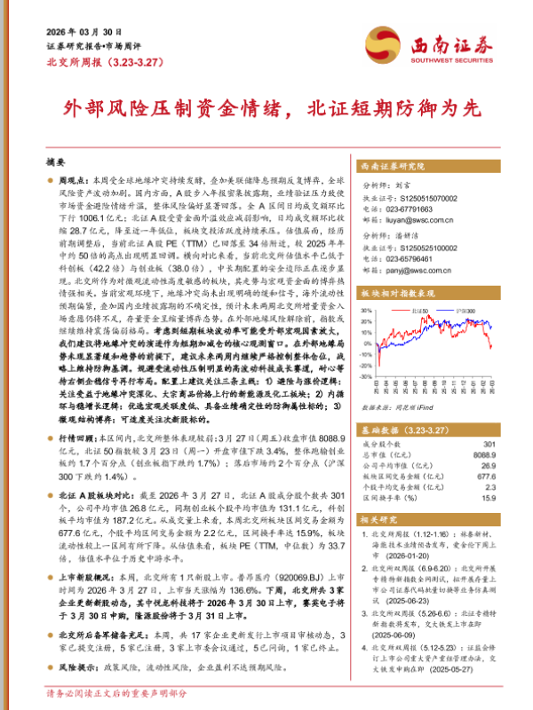 【西南证券】【202603】外部风险压制资金情绪,北证短期防御为先-18页 证券期货研究报告