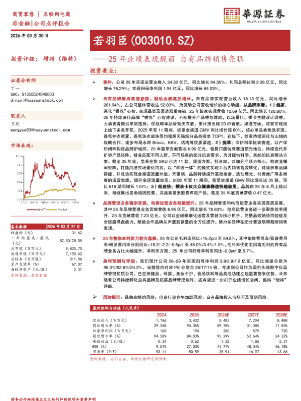 【华源证券】【202603】若羽臣(003010.SZ)——25年业绩表现靓丽自有品牌销售亮眼-3页 证券期货研究报告