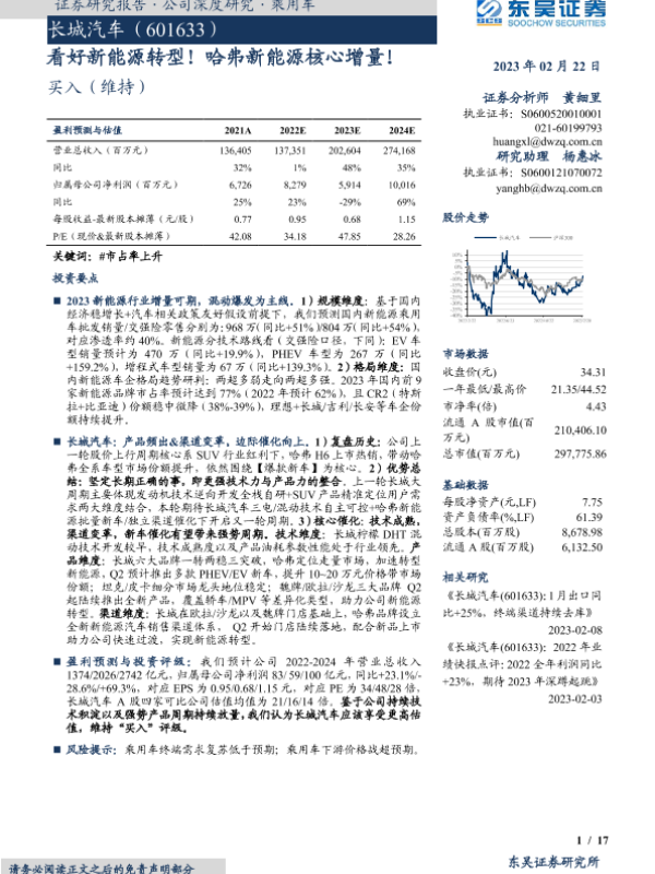 【东吴证券】【20230222】看好新能源转型!哈弗新能源核心增量!-17页 行业研究