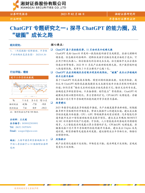 【湘财证券】【20230208】半导体行业事件点评:ChatGPT专题研究之一:探寻ChatGPT的能力圈,及“破圈”成长之路-5页 行业研究
