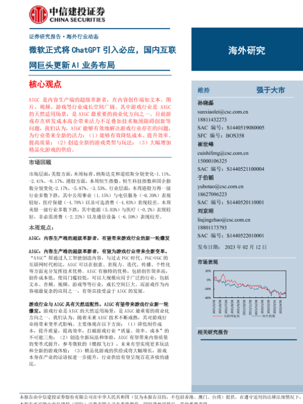 【国信证券】【20230212】传媒互联网周报:ChatGPT加速商业化,看好AIGC在游戏、数字人领域的应用-25页 行业研究