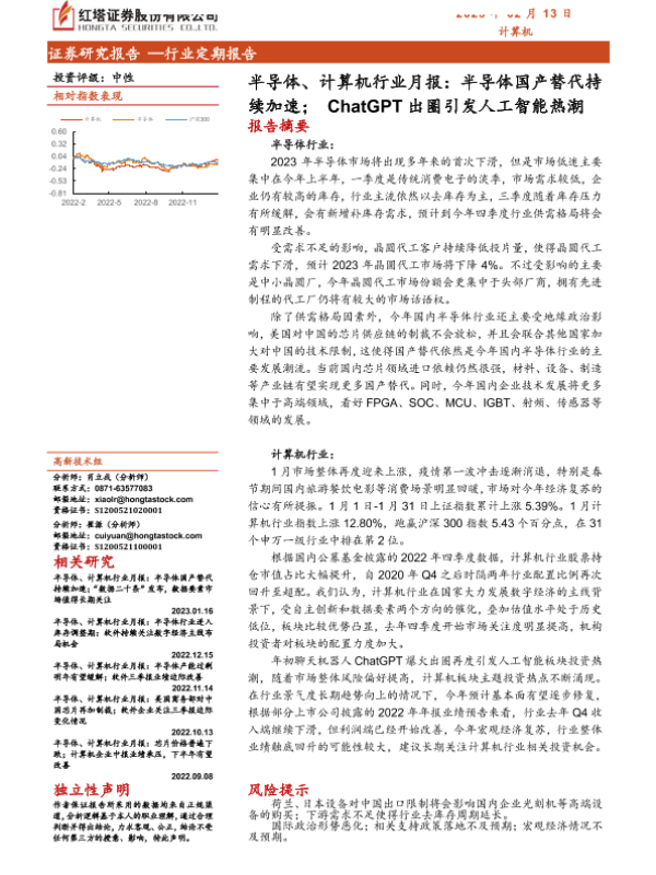 【红塔证券】【20230213】半导体、计算机行业月报:半导体国产替代持续加速;ChatGPT出圈引发人工智能热潮-18页 行业研究