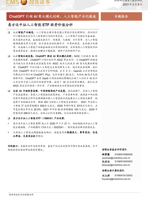 【海通证券】【20230208】易方达中证人工智能ETF投资价值分析:ChatGPT引领AI商业模式创新,人工智能产业化提速-18页 行业研究