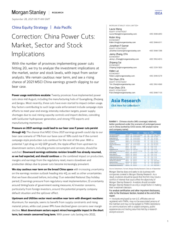 【Morgan Stanley】【20210928】中国限电:市场、行业和股票的影响-25页 行业研究