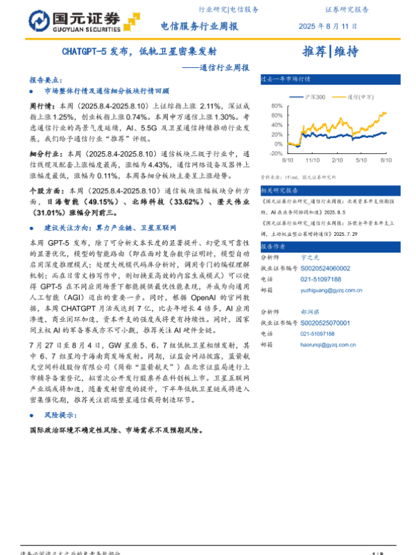 【国元证券】【20250811】通信行业周报:CHATGPT-5发布,低轨卫星密集发射-8页 行业研究