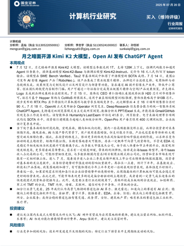 【国金证券】【20250720】计算机行业周报:月之暗面开源KimiK2大模型,OpenAI发布ChatGPT Agent-10页 行业研究