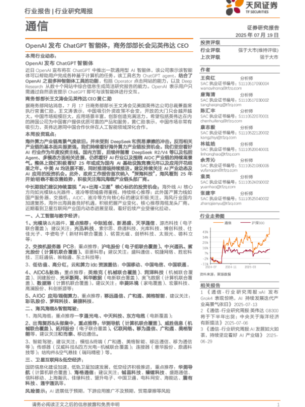 【天风证券】【20250719】通信行业研究周报:OpenAI发布ChatGPT智能体,商务部部长会见英伟达CEO-11页 行业研究