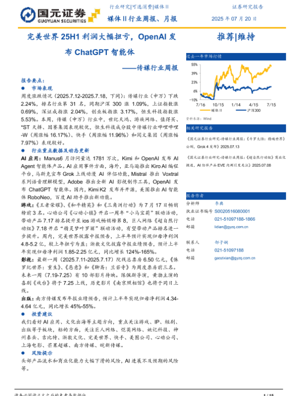 【国元证券】【20250720】完美世界25H1利润大幅扭亏,OpenAI发布ChatGPT智能体-15页 行业研究