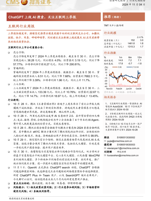 【海通证券】【20241104】互联网行业周报:ChatGPT上线AI搜索,关注互联网三季报-10页 行业研究
