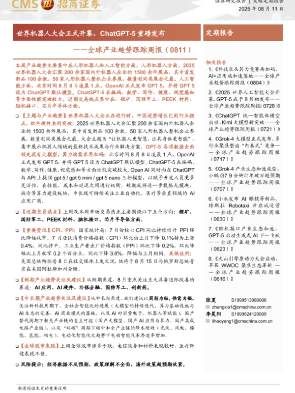 【海通证券】【20250811】全球产业趋势跟踪周报:世界机器人大会正式开幕,ChatGPT-5重磅发布-28页 证券期货研究报告