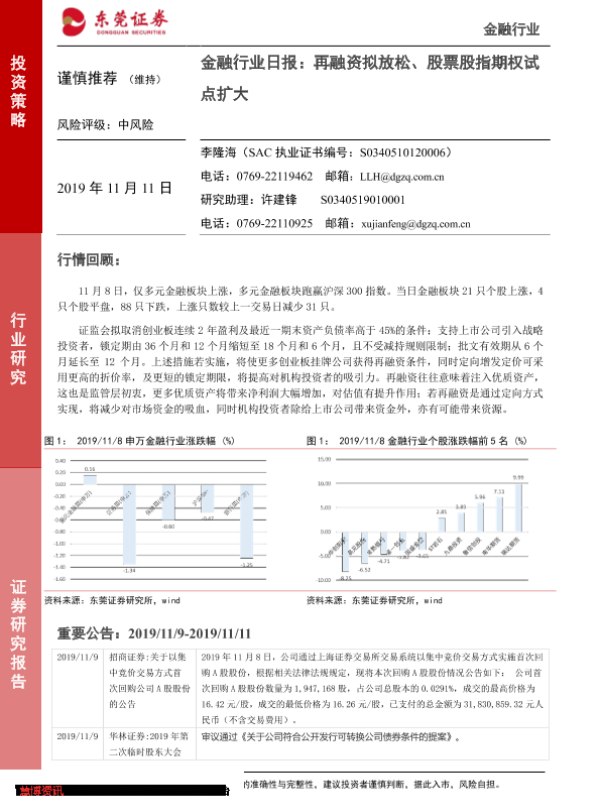【东莞证券】【20191111】金融行业日报:再融资拟放松、股票股指期权试点扩大-5页 行业研究