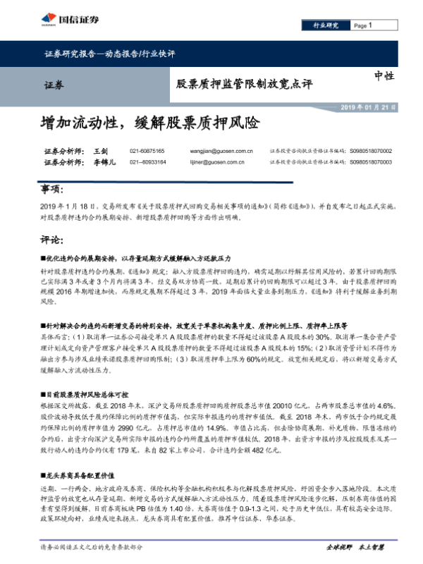 【国信证券】【20190121】证券:股票质押监管限制放宽点评-3页 行业研究