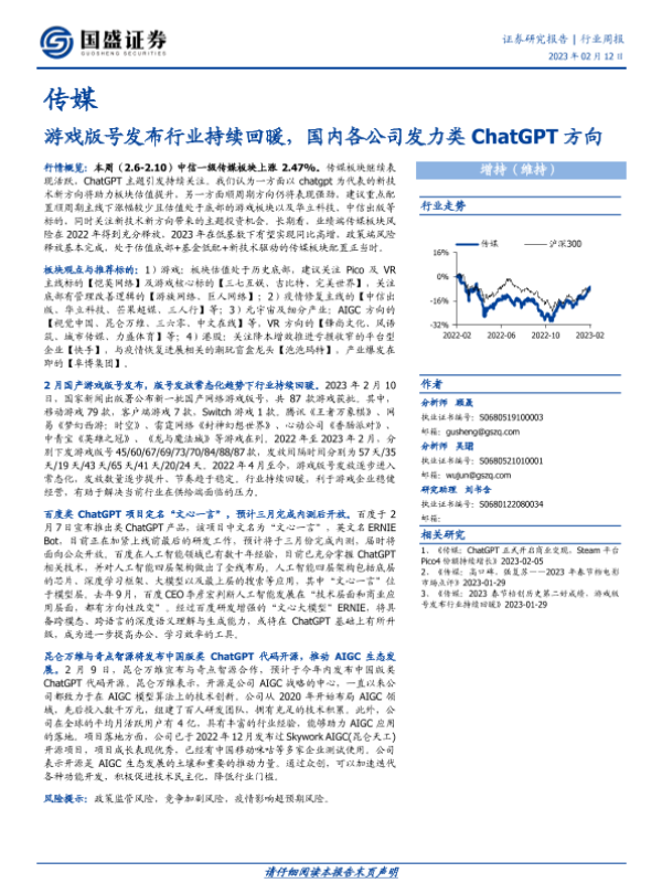 【国盛证券】【20230212】传媒行业周报:游戏版号发布行业持续回暖,国内各公司发力类ChatGPT方向-10页 行业研究