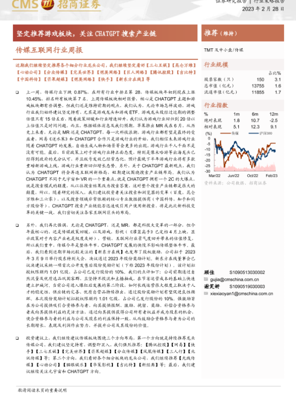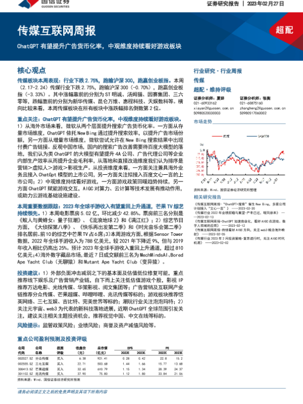 【海通证券】【20230228】传媒互联网行业周报:坚定推荐游戏板块,关注CHATGPT搜索产业链-12页 行业研究