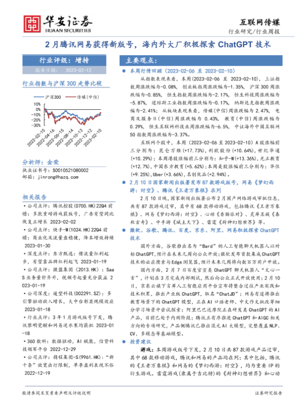 【华安证券】【20230212】2月腾讯网易获得新版号,海内外大厂积极探索ChatGPT技术-29页 行业研究