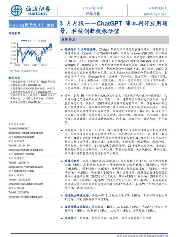 【海通证券】【20230305】3月月报:ChatGPT降本利好应用场景,科技创新提振估值-13页 行业研究