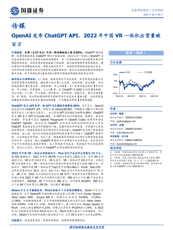 【国盛证券】【20230305】OpenAI发布ChatGPT API,2022年中国VR一体机出货量破百万-10页 行业研究