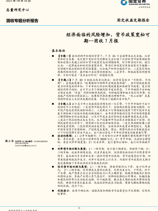 【国金证券】【20210803】固收7月报:经济面临的风险增加,货币政策宽松可期-22页 行业研究