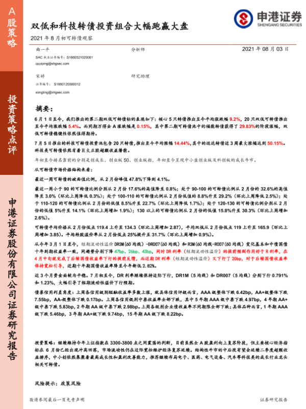 【申港证券】【20210803】2021年8月初可转债观察:双低和科技转债投资组合大幅跑赢大盘-27页 行业研究