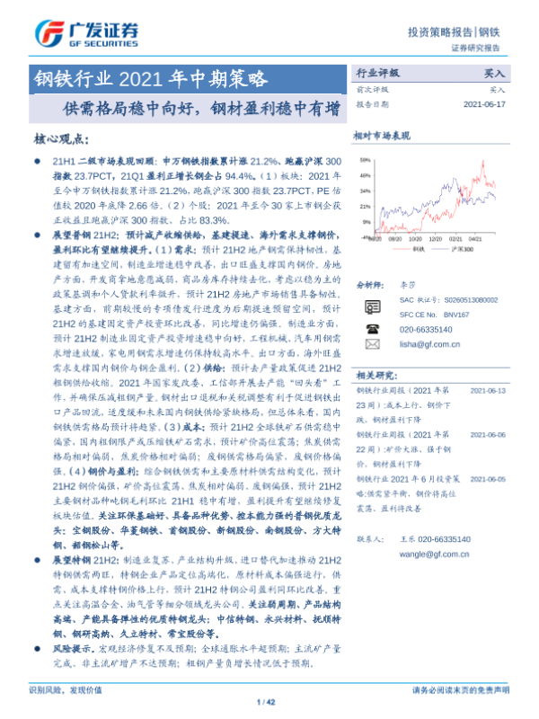 【广发证券】【20210617】钢铁行业2021年中期策略:供需格局稳中向好,钢材盈利稳中有增-42页 行业研究