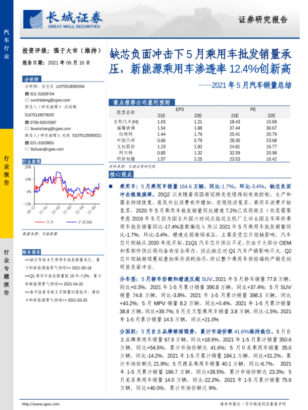 【长城证券】【20210616】汽车行业2021年5月汽车销量总结:缺芯负面冲击下5月乘用车批发销量承压,新能源乘用车渗透率12.4%创新高-21页 行业研究