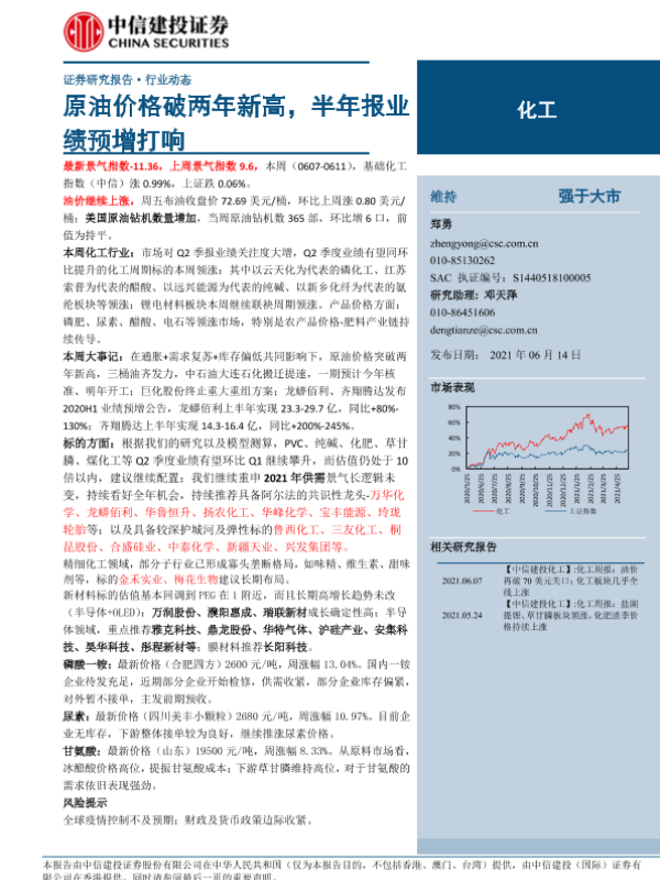 【中信建投证券】【20210614】化工行业:原油价格破两年新高,半年报业绩预增打响-22页 行业研究