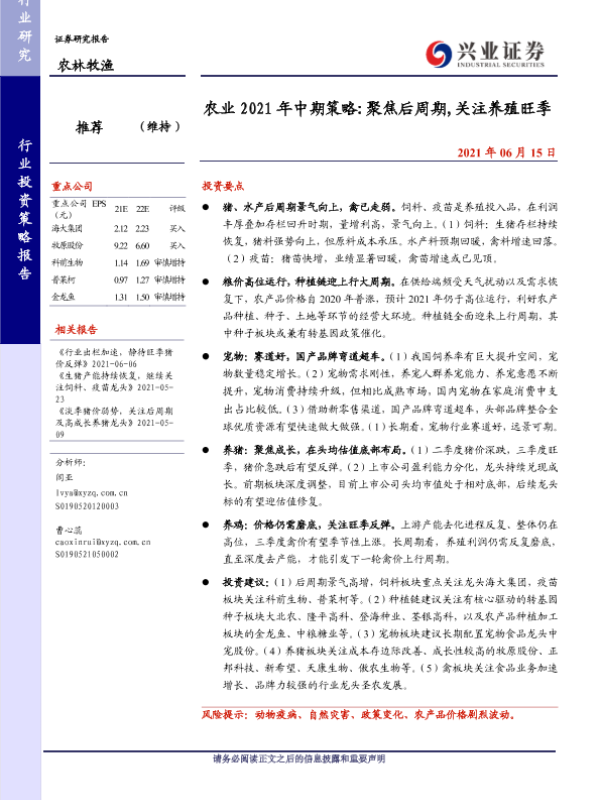 【兴业证券】【20210615】农业2021年中期策略 聚焦后周期,关注养殖旺季-32页 行业研究
