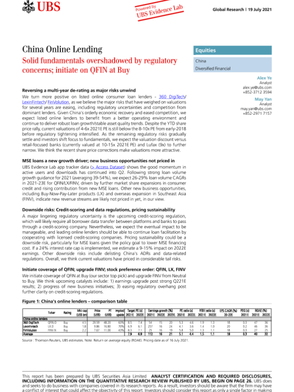 【瑞银】【20210719】中国金融行业之网上贷款-坚实的基本面被监管担忧所掩盖;在购买时启动计量金融-35页 行业研究