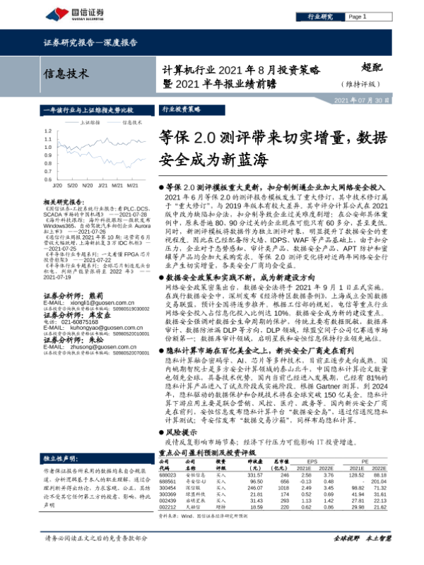 【国信证券】【20210730】计算机行业2021年8月投资策略暨2021半年报业绩前瞻:等保2.0测评带来切实增量,数据安全成为新蓝海-17页 行业研究