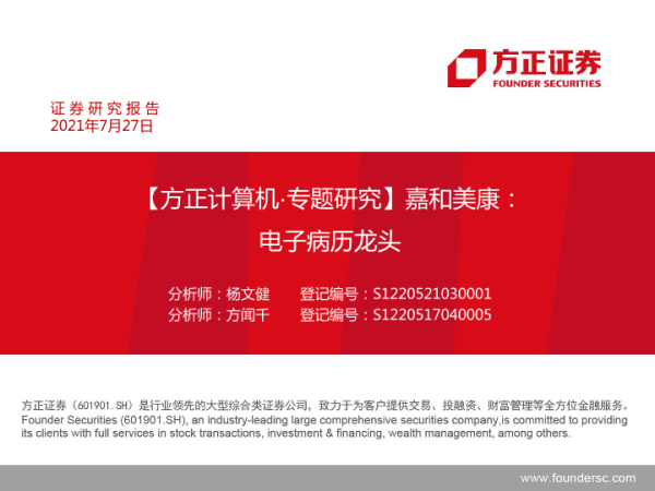 【方正证券】【20210727】计算机行业专题研究:嘉和美康,电子病历龙头-40页 行业研究
