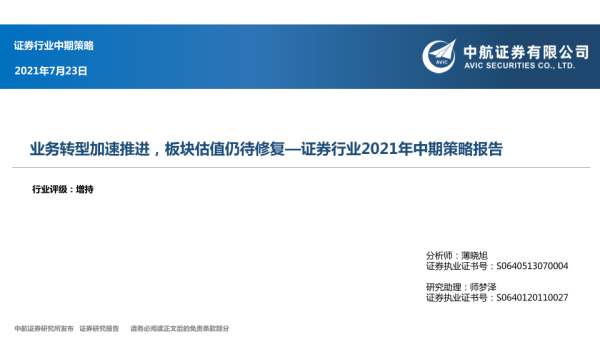 【中航证券】【20210723】证券行业2021年中期策略报告:业务转型加速推进,板块估值仍待修复-39页 行业研究