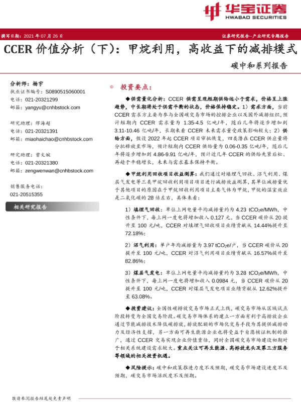 【华宝证券】【20210726】碳中和系列报告:CCER价值分析(下):甲烷利用,高收益下的减排模式-22页 行业研究