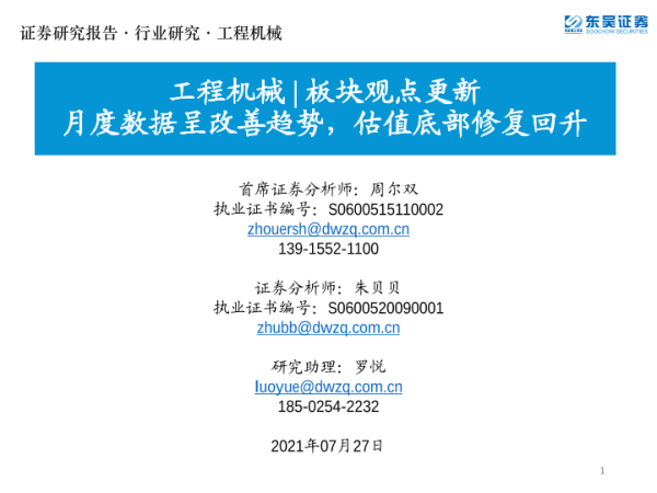 【东吴证券】【20210727】工程机械板块观点更新:月度数据呈改善趋势,估值底部修复回升-30页 行业研究