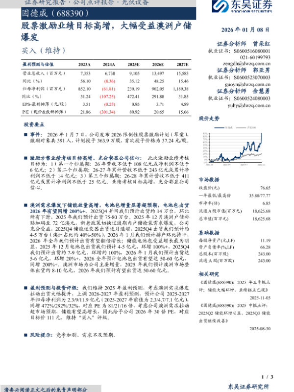 【东吴证券】【202601】股票激励业绩目标高增,大幅受益澳洲户储 爆发-3页 证券期货研究报告