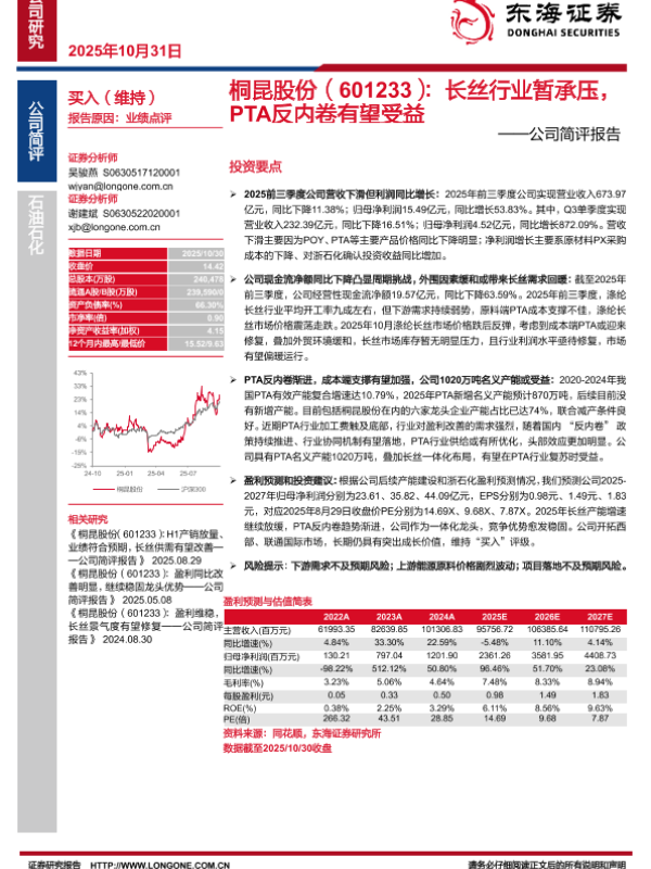 【东海证券】【202510】桐昆股份(601233):长丝行业暂承压, PTA反内卷有望受益-3页 证券期货研究报告