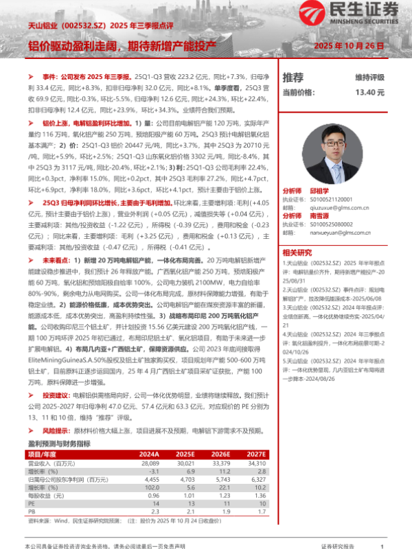 【民生证券】【202510】2025年三季报点评:铝价驱动盈利走阔,期待新增产能投产-3页 公司研究